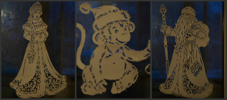 вырезаю канцелярским ножом. и вырезаю на газете в несколько слоев, мне так удобнее чем на доске. приклеиваю к окну на скотч, чтобы можно было в следующем году использовать