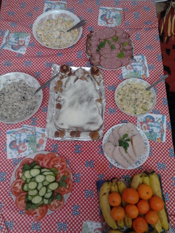 Потом праздничное застолье, феерверки на улице, дискотека дома))).Спать легли в пол четвертого Из блюд готовила:Оливье(ну какой Новый год без него)),крабовый салат и салат из ананасов с курицей и грибамигрибами,холодец. На горячее-запеченое мясо(свинина)с чесноком(потом порезала кусочками).Картофель с мясом на протвине род сыром в духовке. На сладкое-торт и конфеты. К сожалению фото не все,так как телефон временно дочери,а он простенький и памяти мало(мой разбился(().