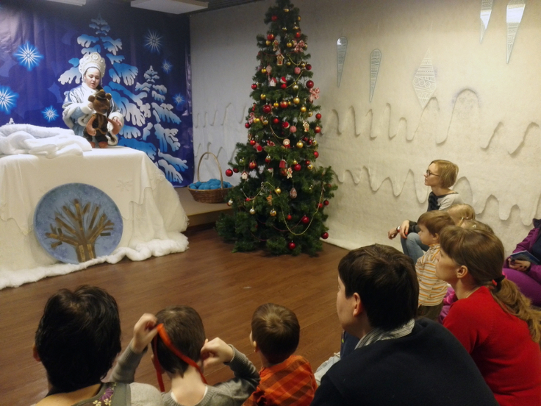 Малышам показали кукольную сказку, Вовка впервые увидел деда Мороза:) В садик то мы пока не попали и праздники пропустили. Поэтому ему было страшноватенько:)))