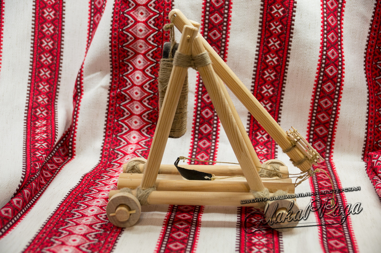 Дети постреляли, им понравилось. Стерший выбрал катапульту, средней понравился требушет (он побольше). А младшая выступала в роли великана-разрушителя.