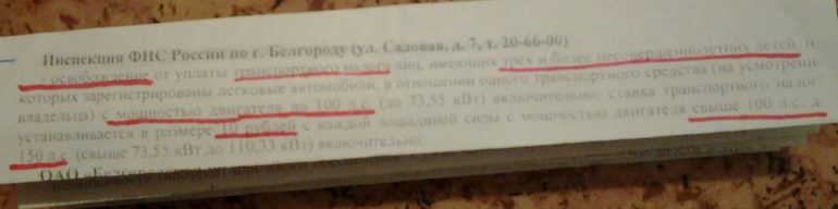 Освобождение от уплаты транспортного налога лиц, имеющих трех и более несовершеннолетних детей на которых зарегистрировпны легковые автомобили, в отношение одного транспортного средства (на усмотрение владельца) с мощностью двигателя до 100л.с. (до 73,55 кВт) включительно; ставка транспортного налога устанавливается в размере 10 рублей с каждой лошадиной силы с мощностью двигателя свыше 100 л.с. до 150 л.с. (свыше 73.55 кВт до 110,33 кВт) включител но.