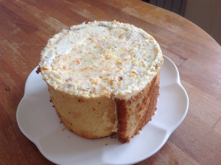 Снять с противня тесто, прямо на бумаге можно разрезать его на 4 полоски одинаковой ширины! Я разрезала вертикально в этот раз и поняла, что торт высоковат, следущий раз хочу горизонтально попробовать разрезать, он должен быть ниже, но больше в диаметре.