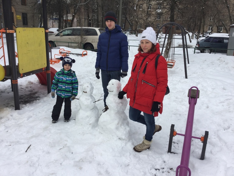 Денька обрадовался, что наконец-то все вышли с ним погулять. У дома кучками переговаривались жильцы. А мы слепили двух снеговиков.