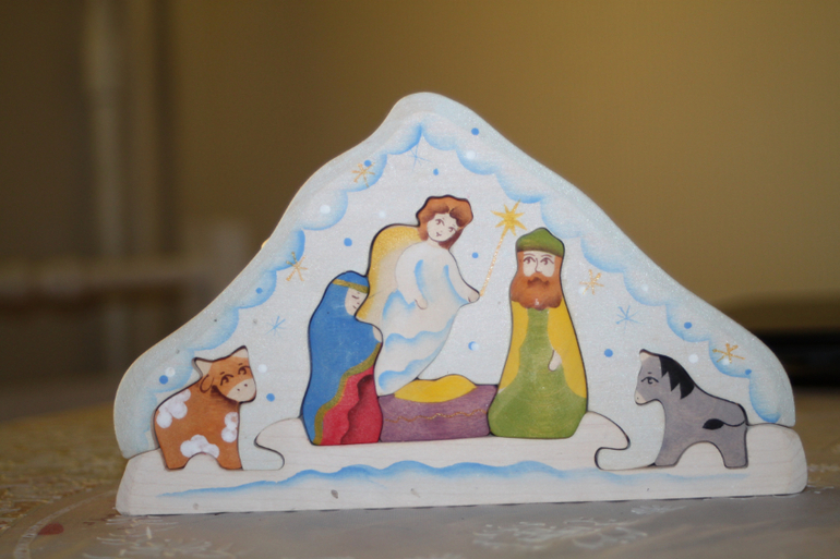 13. супер игрушка - деревянный паззл сказка. у нас сюжет рождество. разбирает сам, на место части ставит тоже сам, но тут довольно сложно их умостить, так что нужна помощь обязательно.