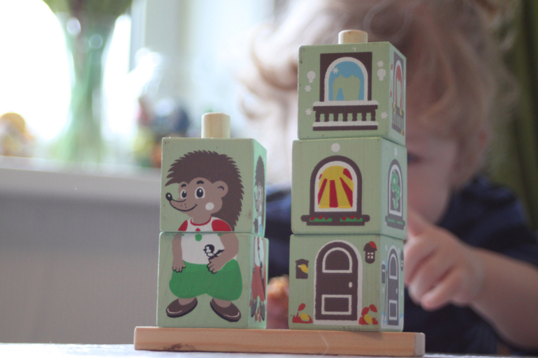 2. кубики с ежиком. суперские совершенно, нужно просто одеть кубики на штыречки, так, чтобы дверь домика была внизу, а голова ежика на его ногах. играет ими много. обычные кубики собери картинку тоже есть, но пока не вызывают интереса.