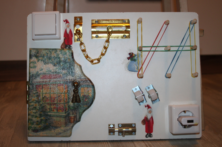 1.доска, которую я сделала перед новым годом, и которая мне уже не нравится, потому что я хочу добавить на нее еще кучу прибамбасов)))) продолжает пользоваться любовью))) сидит, снимает одевает резинки, защелкивает замки и тд.