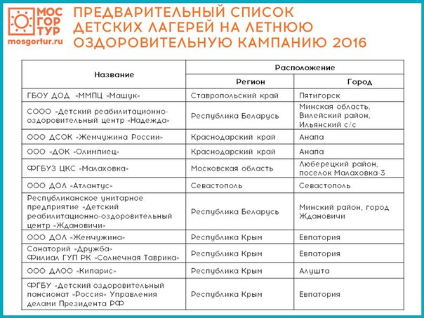 Детки многодетных семейОзнакомиться со списком лагерей и баз, где летом 2016 года будут отдыхать дети по льготным путевкам от Правительства города Москвы, можно будет уже в этот четверг 17 марта на сайте и в группах Мосгортура в социальных сетях.