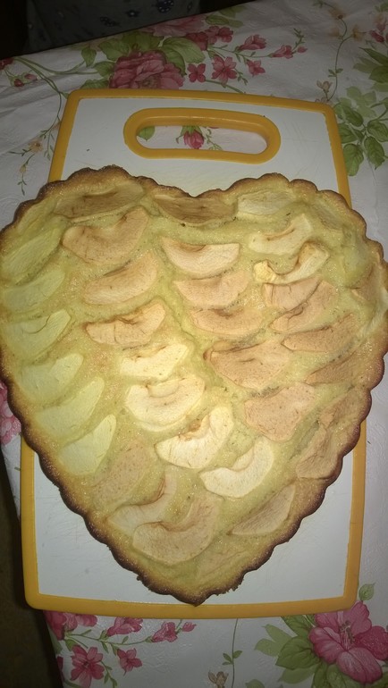 Всё взбить, соду добавить в конце. Выложить на форму порезанные яблоки и залить тестом. Выпекать в духовке при t 200 градусов примерно 15=20 минут