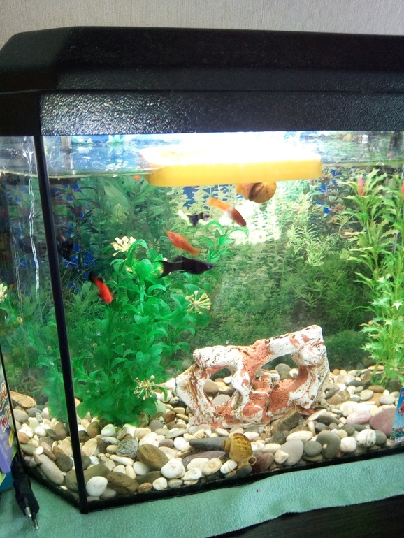 Наш аквариум. Ничего особенного - гуппи, меченосцы, моллинезии, улитки - ампулярии. Это хобби я унаследовала от папы.