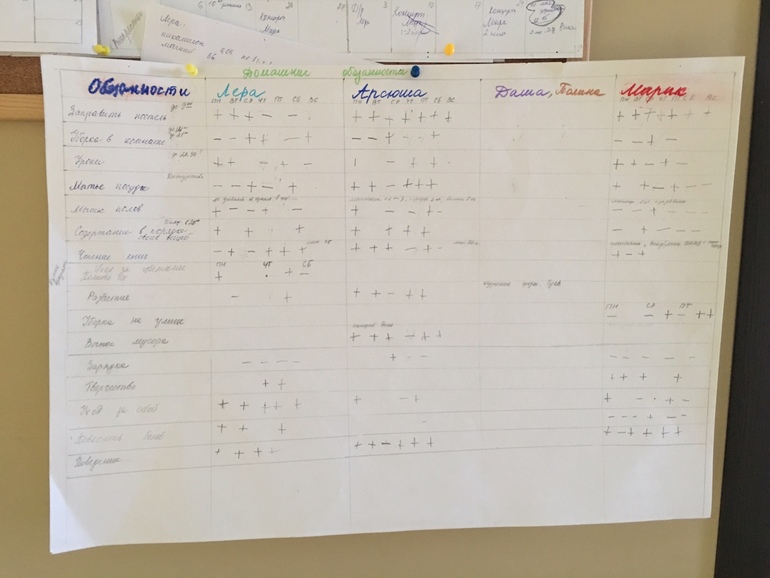 В связи с этим, именно для нашей семьи, мы создали мотивирующую таблицу. У самых младших, тоже есть свои обязанности, это заправить постель, убрать игрушки, отнести посуду в раковину, но пока не учитываю в таблице это. Каждый ребенок знает, что ему надо сделать, может таблица не очень понятна вам, но понятна нашей семье и конечно, я ее совершенствую, добавляю или убираю обязанности и тд.. Например: вынос мусора, на одной неделе закрепляется за определенным ребенком. То есть, всю неделю, только он знает, что надо вынести мусор, тоже самое с уборкой во дворе и уход за цветами.