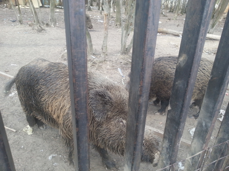 Подмосковье,по Ярославскому шоссе, г. Ивантеевка. Неработающий ныне пансионат "Астория". А животные там остались - все кормят их. Кабаны оочень активные и здоровые. Оленей много, около 10.