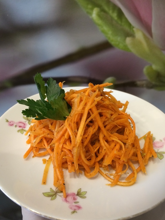 К морковке добавить 5 ст л уксуса(9%), 4 ст л сахара, 2 ч л соли, 2-3 ч л с горкой молотого кориандра, 1 ч л перца черного молотого. Все перемешать, отставить. 1 большую луковицу нашинковать, обжарить в 100,0 подсолнечного масла. В конце добавить 1 ч л красного перца. Кто любит по острее можно острый. Все это вылить на морковку. Добавить 4 зубчика чеснока( выдавить) перемешать. Дать настояться 2 часа. Можно больше. Это основа. По желанию можно добавить отварной кальмар, сельдь. Это то, что мы пробовали))) Ну очень вкусно 😋 !