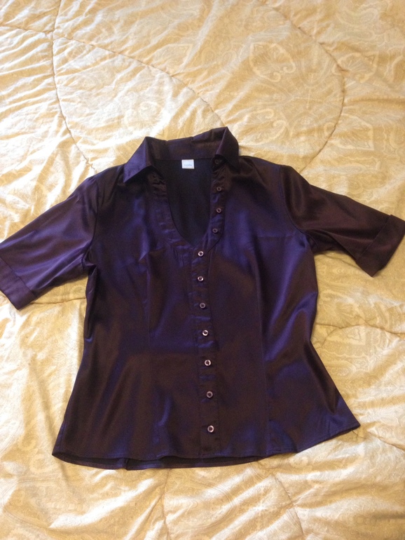 12. Атласная блуза цвета баклажан. На 46 размер. Хорошо будет с серым костюмом выше.