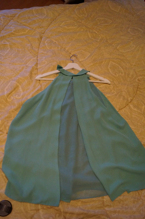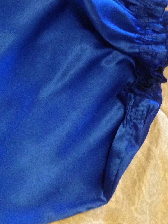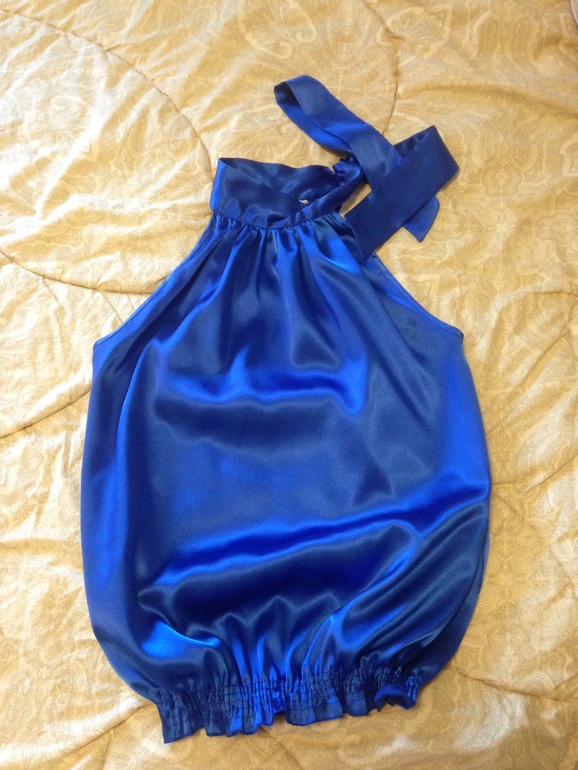 13.Синяя атласная блузка с бантом на шее. Одевала пару раз, но есть небольшая затяжка снизу. При носке не очень заметна. Может можно исправить, не пробовала.