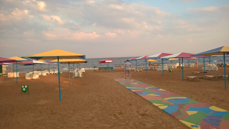 Сначала идет песчаное дно, потом подводная каменная гряда, а затем глубина. Через гряду выложена дорожка из мешков с песком. По бокам от пляжа тоже каменные гряды, но по-моему поправленные людьми.
