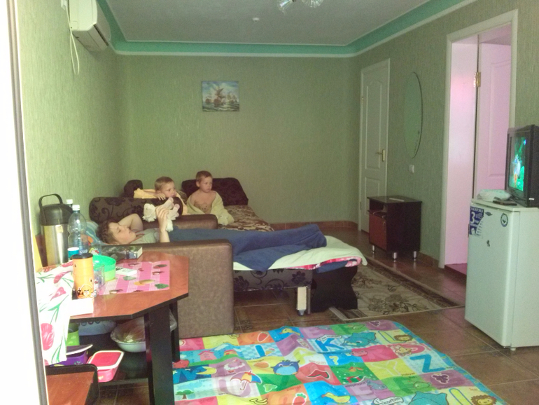 К сожалению нет фото большой комнаты не разложенной мебелью. Там стоит большой угловой диван и кресло-кровать. Хотя мы каждое утро складывали мебель в первоначальное состояние - сфотографировать не догадались.