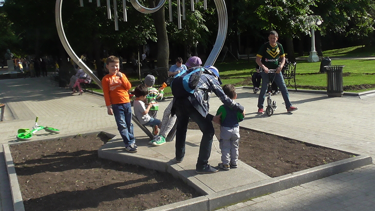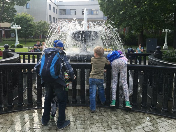 В парке было непривычно тихо и малолюдно,что безусловно вдохновляло.Мы нашли уютное местечко и покормили детей всякими вкусностями,прихваченными из дома,после чего продолжили прогулку у фонтана.Вообще всем родителям с детьми очень советую это место.Там очень красиво и чисто,множество прекрасных ротонд,скамеечек,кусты шиповника,фонтаны,а главное...великолепная детская площадка с необычными и интересными развлечениями для деток разных возрастов.На этой самой площадке мы провели часа два,до самого вечера дети резвились там.И мы,понятное дело,резвились вместе с ними.)))