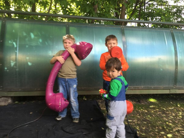 От метро до Театра пешком минут 10-15.Праздник начинался в 14 часов.По дороге всем детям раздавали бесплатное мороженое.Мы ездили гулять вместе с подругой и её детишками,поэтому компания получилась большая и весёлая.)))На территории Театра нас ждала спасительная тень,солнце в тот день палило нещадно.Под сенью листвы для детей были организованы множество столов с карандашами,мелками,фломастерами и бумагой.А на центральной площадке всех желающих развлекали аниматоры и показывали кукольные представления.
