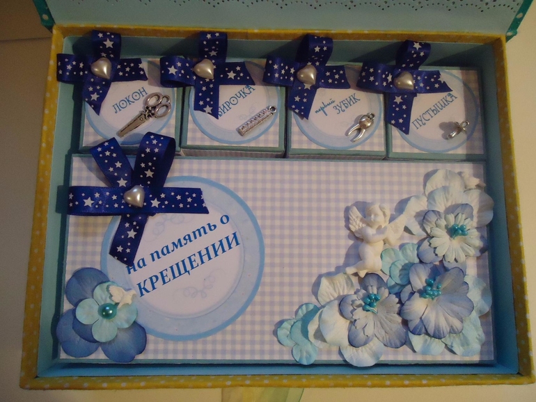 Понравилось в голубых тонах с лентами-зведочками, с коробочкой "На память о крещении". Сколько такая?