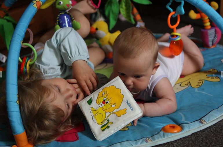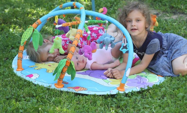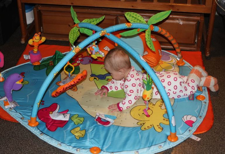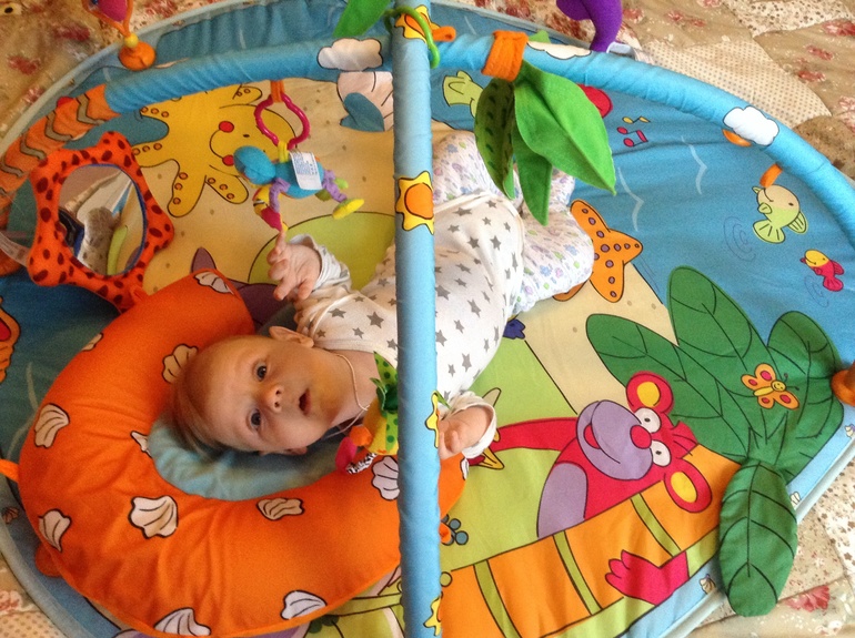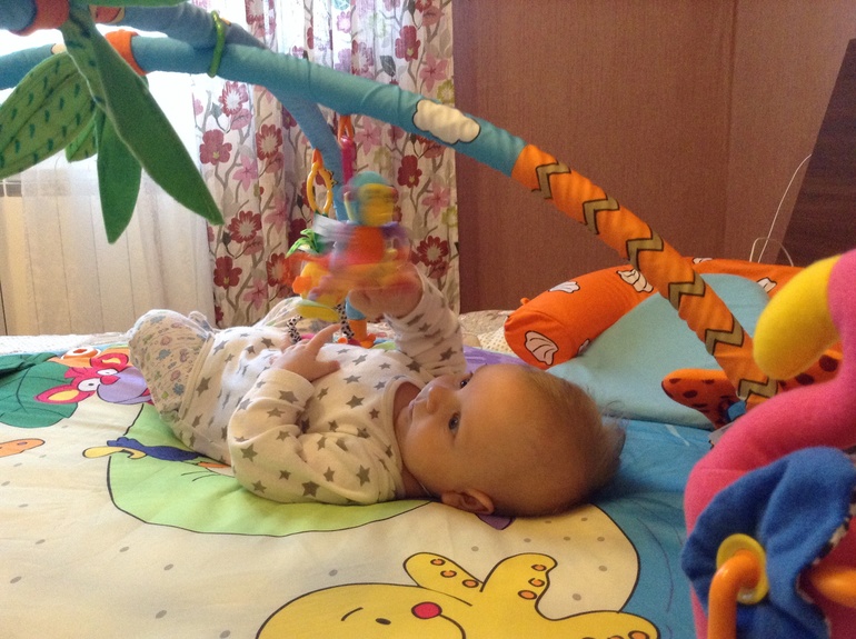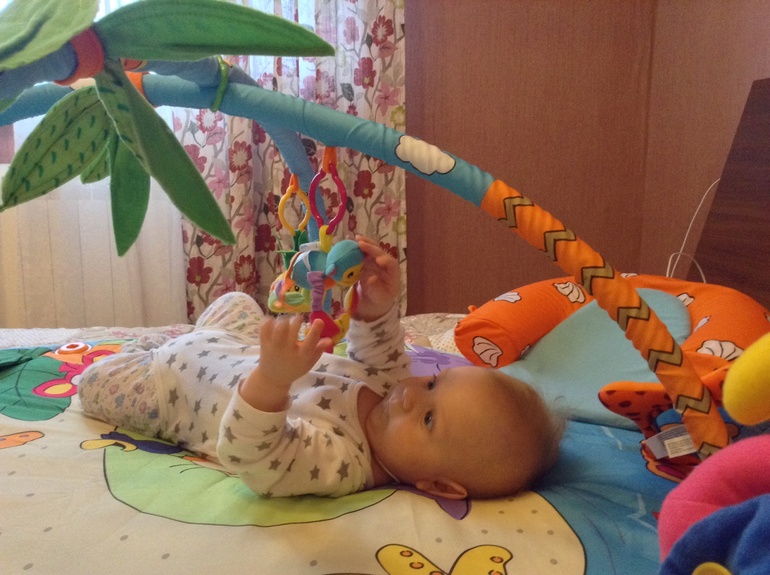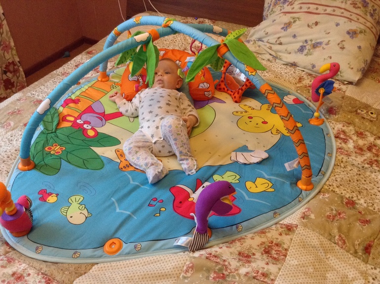 Делюсь/рекомендую/советуюМоя мама к нам не ходит в том числе потому, что у нас все не как у людей... Страшно сказать, как дети спят. Лешка с Васей вдвоем на диване раскладном, при этом 4 года назад им была куплена 2-х ярусная икеевская кровать. Необъяснимым образом, одна ее половина переехала на дачу, а на второй почему-то спит наш папа (!). А Лиля бедняжка спит в детской кроватке, из которой уже почти выросла), по идее, туда нужно Гришу, но Гриша спит со мной в отдельной комнате на нашей двуспальной супружеской кровати))). У мамы от всего этого ум заходит за разум, она впадает в неконтролируемую ярость, и мы страшно ругаемся. Уже почти 2 месяца ждем заказанную мебель, которая должна наконец обеспечить всем пристойные спальные места. Я наконец повешу на кроватку мобиль, и Гришенька будет там тусоваться хотя бы днем. Сейчас его место обитания - это качели на кухне и наша кровать. Качели бесподобны, очень выручают, ездили с нами на дачу, но я чувствую, что ему уже нужно больше свободы и движения, а на кровати ему лежать и печально смотреть в потолок как то не очень. И вот я вспомнила про развивающие коврики с дугами. У нас были пара таких, но безжалостно растерзаны детьми. Погулила я в инете, и чуть не скончалась от асфиксии - 4,5-5,5 в среднем за коврик нужный от силы до года. Я поняла, что мы нищеброды (вот сперла слово у Ленорки, так оно мне нравится))), нужно экономить, и пошла на авито. Тут же нашелся в моем славном городке коврик tiny love в идеальном состоянии))). Да с доставкой к подъезду, да по цене в 4 раза ниже магазинной))). Прелесть что за коврик - очень большой, куча интересностей на нем, но меня совершенно покорили вертикальные игрушки - какая отличная придумка - малыш будет стремиться к ним подползти, и дуги можно переставлять произвольно, они очень легко крепятся. Я таких моделей больше не видела. Дети старшие были в восторге, лежали все втроем, еще самого старшего не было). Григорий Михайлович оценил))). Я все стояла, наблюдала, как он забавно с игрухами общался, так интересно и смешно, не оторваться просто. В общем, ужасно рада покупке. Надо еще мяч прикупить)))