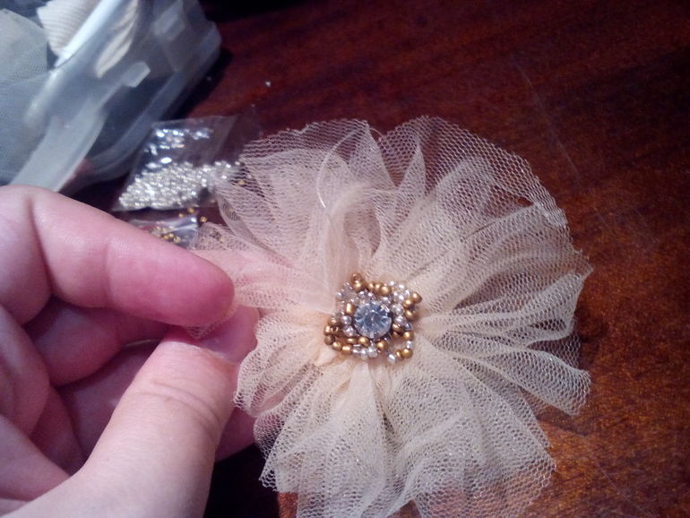 Прямо в день венчания я подумала о том, что не хватает мне ещё и брошки на платье. Хорошо, что некоторые запасы бисера, бусинок и всего такого имеются. Так что, за минут 20 родилось вот это