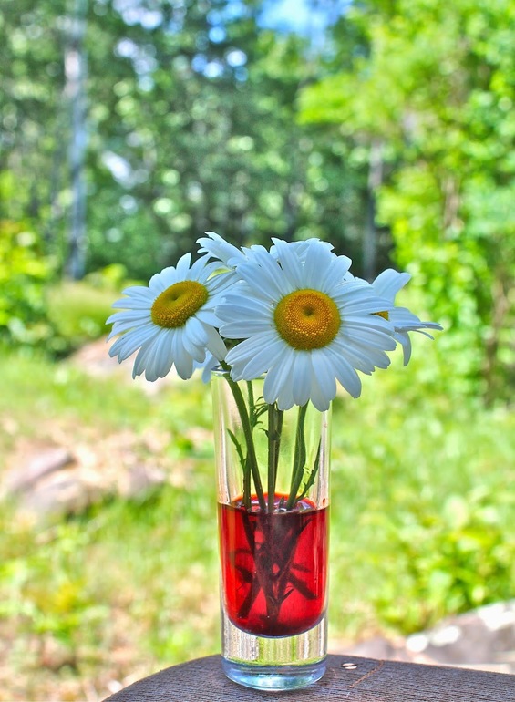 3. Подрежьте цветам стебли. Ножницы для этой цели не годятся - только острый нож. Обрезать стебель нужно наискось под углом 45 градусов в теплой воде. Постарайтесь при перемещении цветов из воды в емкости с красителями сделать это максимально быстро, зажав срез пальцем, т.к. при контакте с воздухом в микропорах стебля образуются воздушные пробки, мешающие воде свободно проходить по стеблю. Обрежьте стебли покороче, чтобы краситель по ним быстрее добрался до лепестков цветов.
