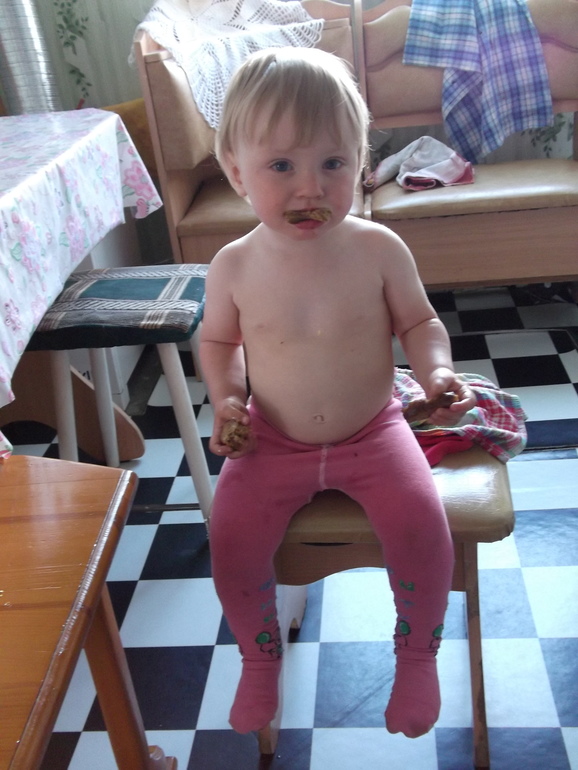 Она не голодная, только покормила.Дети любят черный хлеб с деревенским маслом.Аня ест его так выкивиривая с хлеба пальцем..Этот бандит порвала говорящую азбуку, просто пальчиков выкивирила в клеёнки дырочку, потянула..всю переклеила скотчем.Разрисовала дома весь пол.Ест грязь, поливает с лейки себе ботинки.Ныряет в лужи.Прикол засыпает как ляля..так и говорит ляля..Я её закутываю в одеялко ана утыкивается мне в подмышку ..так засыпает.Смешная.) Говорит и показывает сколько ей годиков.-Дин!И самая главное -Мама (очень громко) по какая!))(она по какала)