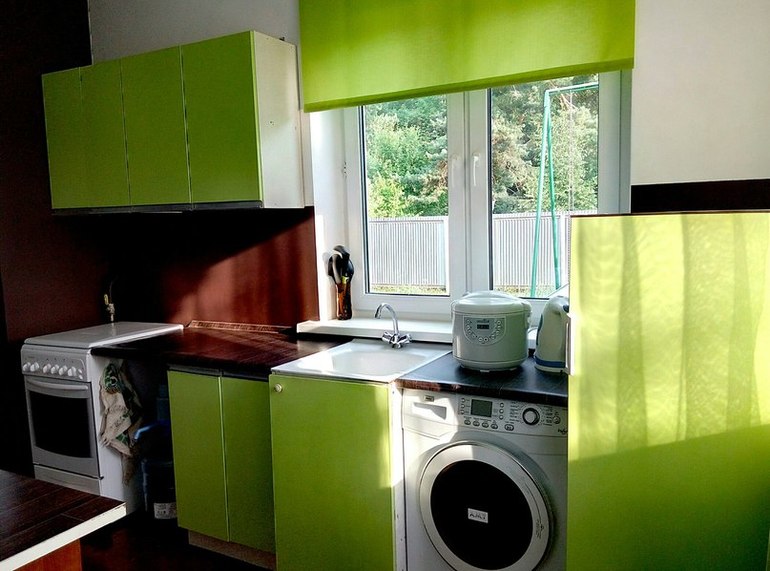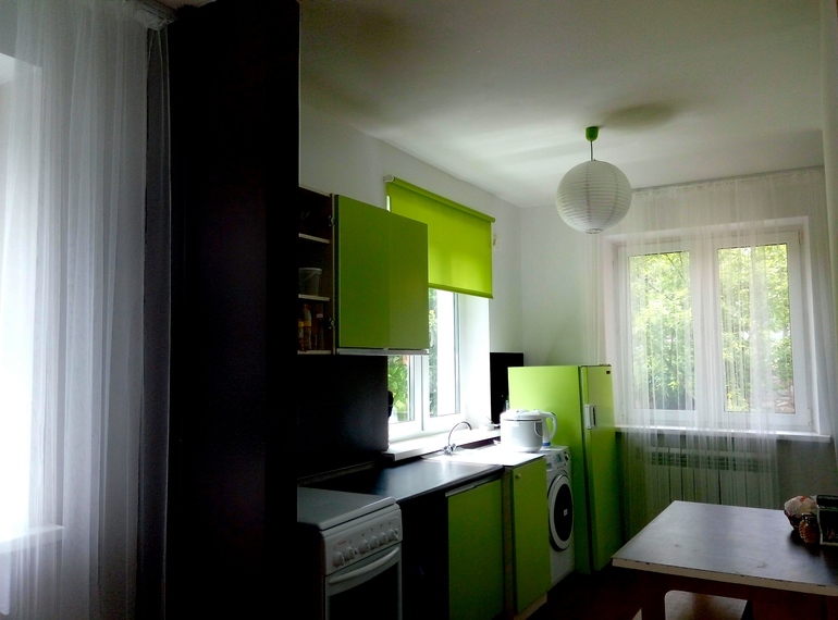 Вложили как и хотели мизер 8000 руб(самой смешно) : снесли стену одну как раз где кухонный фартук для соединения с залом, перенесли мойку к окну, покрасили шкафы и холодильник, стены, сделали столешницу, поменяли шторы советские на новые, люстру советскую убрали. Осталось доделать столешницу над стиралкой и довесить зеленые дверцы шкафа над плитой. Разрешили спор с мужем: какую лучше кухню заказывать при кап ремонте белую или зеленую, будем потом брать белую для дома для расширения пространства, а салатовую сделаем в квартире.