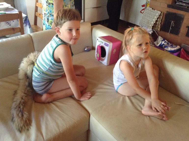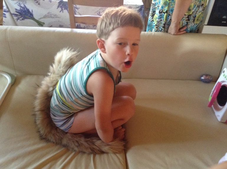 Дети отрыли старый меховой воротник, и стали кошками, точнее Киской и Котом-Баюном))). Хвост первой нашла Лиля, но по доброте душевной уступила сначала Васе ровно на 10 минут, при этом ей очень хотелось заполучить его быстрее назад, и все эти 10 минут она страшно ныла.