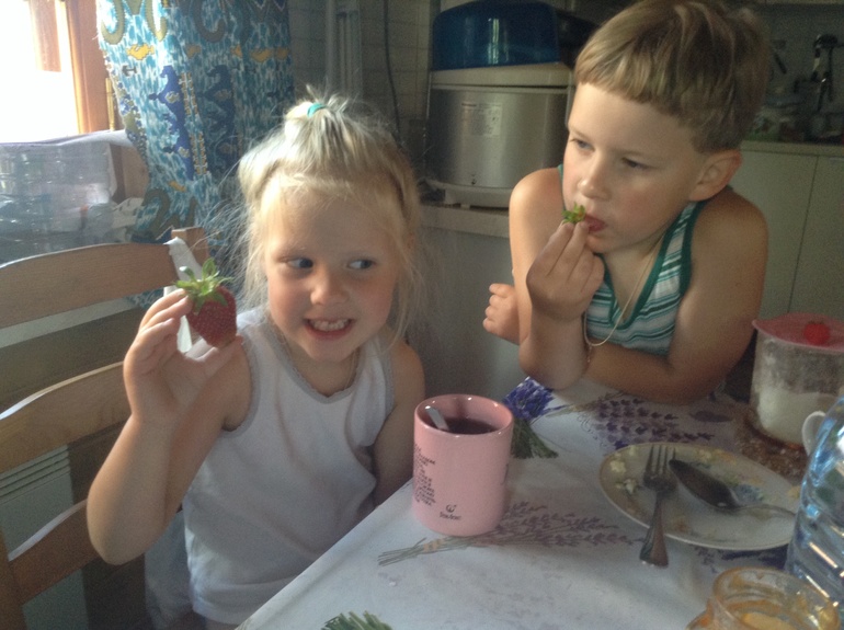 у нас уже неделя клубн ка, думаю еще пару раз соберем и все.. на заготовки ее никогда не хатает, так едим, собираю через день, а еще земляника пошла, правда в этом году совсем мало, свекровь по утрам с подруженциями в поле ходит, чей то муж их подвозит туда обратно, а мы с мелкими пару раз за зады деревни сходили, маленький тазик насобирали,девчонкам что то понравилось собирать, а я ее только есть люблю, вчера все плечи спалила,бхоия не жарко было, но от ветра вся подгорела:-( сейчас опять требовать начнут, девочки с кувшинчиком:-) уже ее и с твком ели и с молоком и с йогуртом и сгущенкой, сегодня оладушки творожные пекла,а клубнику с земляникой вилкой с сахаром к ним намяла, вкуснятина:-)
