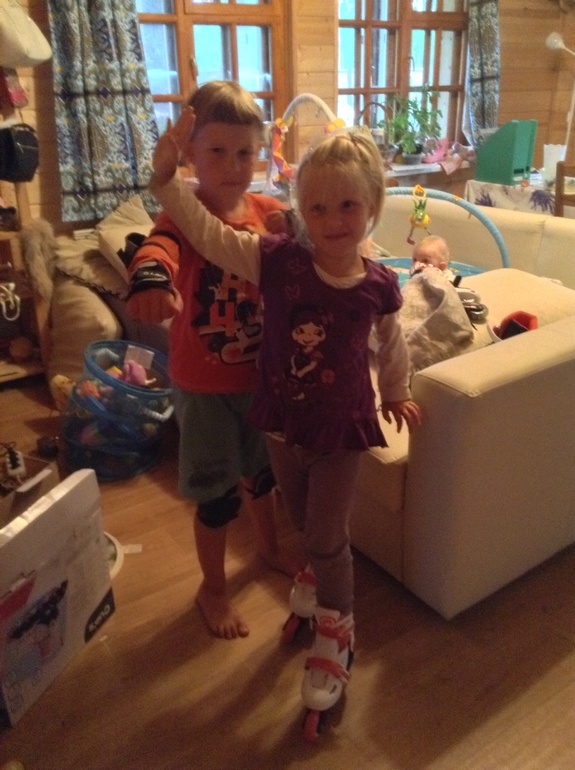 Детки многодетных семейПриехала наша бабушка и как добрая крестная-фея одарила всех подарками))) Хитом стали ролики! С утра одевали-примеряли, целый день ждали, когда пойдем кататься. А дождик каждые пол-часа заряжал, так и не дождались(((. В итоге Лиля потребовала одеть ролики и кататься прямо здесь! Я посопротивлялась, но не устояла. Ролики были одеты, и она уже час катается по дому то со мной, то с бабушкой. Вася одел защиту и играет в робота). Похоже, спать она ляжет тоже в роликах)))