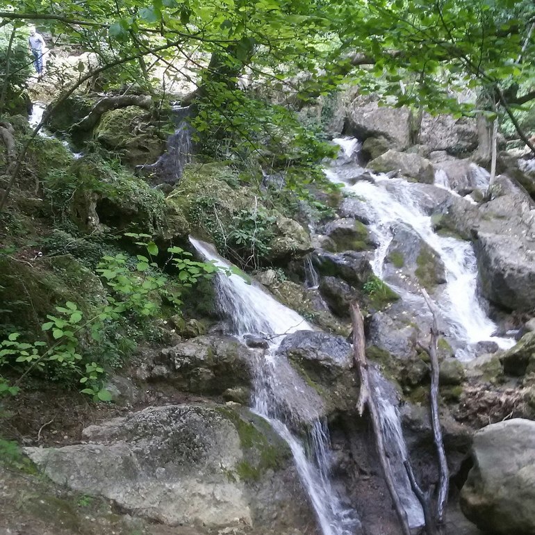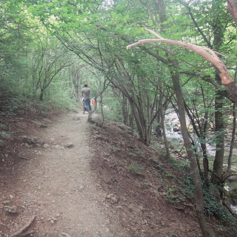 Как-то мы проезжали мимо указателя на водопад, увидели и решили заехать. Так как восхождение не планировалось заранее, то поперлись прямо с коляской и собакой. Тащить нашу трость по узким каменистым тропкам, это подвиг. Мужу пообещала выдать медаль за заслуги - впихнул невпихуемое. Ближе к вершине средний сын устал, собака попыталась притвориться мертвой и поспать, пришлось нести всех. Так и шли - муж коляску прет, я сына с собакой, один старший радостно впереди шагает.