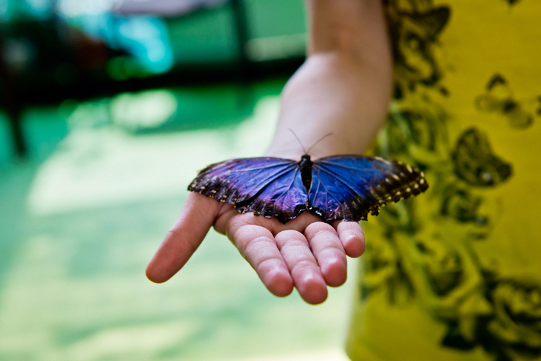 Бабочки садятся на яркие цвета и на вкусные запахи. Но если бабочка сидит на стене и аккуратно правильно подставить ей руку, она переберется на нее.