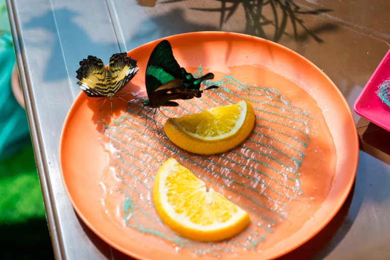 Питаются бабочки резаными апельсинами и водой с медом. Когда пришла ответственная, Кира ей стала помогать выпускать новорожденных бабочек, убирать умерших, кормить всех живых и т.п. В общем, при деле деть был) Сетка чтоб не намочили крылья в сладкой воде.