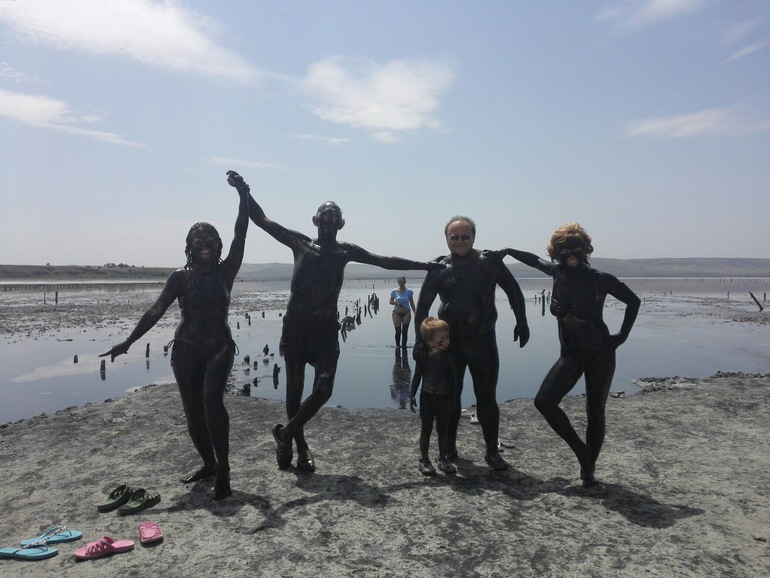 Озеро Чокрак вблизи Керчи. Утонуть невозможно, грязька горячая и соленая) Обратите внимание на даму слева - сорелла моя итальянская приехала на Родину)))) несколько дней отрывалась вместе с нами.