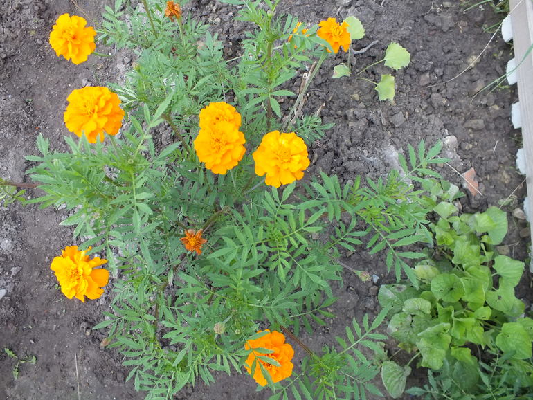 Ну и бархатцы, конечно. Эти цветы меня очень выручили. Я посеяла семена бархоток уже в июне, думала и не дождусь цветения. Но они выросли и отлично цветут.