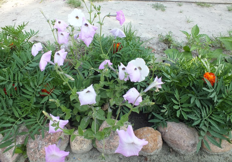 Вот петуния, самая простушка. Пару чахлых кустиков рассады петуний мне отдала соседка как некондицию. У меня эти чахлики очень даже неплохо цветут.