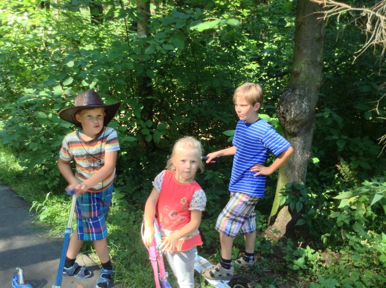 Один день из жизни многомамы (юмор, рассказы)Хотели мы сегодня поехать в Кремль, но не сложилось. Погода отличная, не жарко, дома сидеть неохота, и мы решили организовать одно давно намеченное мероприятие, а именно - поиски сокровищ. На местном форуме одна замечательная мамочка придумала игру: она спрятала в лесопарке клад со всякими драгоценностями: маленькими игрушками, цветными камешками, ручками-блокнотиками и так далее. Сочинила целую сказку с подробными инструкциями как этот клад найти, и выложила на форуме, предложив остальным мамам поучаствовать. Важно было, найдя клад оставить там что-то свое взамен, к нему прилагался блокнотик с ручкой, чтобы записать, что ты взял и что положил. Моим это конечно безумно понравилось, они послушали сказку, и мы отправились в путь. По дороге заехали, купили сокровищ на обмен. С поиском были сложности, один раз мы сбились с маршрута, пришлось вернуться немножко назад и пройти часть заново, потом заключительный этап - тропинка, которая должна была вывести нас к кладу, сильно заросла крапивой, и дети в шортах и футболках не смогли по ней идти. Нам пришлось искать обходной путь, и вот ура, мы у цели, нашли 2 искомых пня под одним из которых должно быть сокровище. Но увы! Нас кто-то опередил, и вопреки правилам, забрал все и ничего не оставил взамен(((. Конечно дети расстроились, но у них были утешительные призы в виде тех подарочков, которые мы купили на обмен. Я выдвинула версию, что должно быть, клад нашел колдун (у которого по сюжету сказки клад и был изъят), это вызвало большое оживление, Леша вспомнил, что когда мы обыскивали пень, кусты рядом подозрительно шевелились, не иначе там и прятался гнусный колдун. Дальше они катались на самокатах и высматривали в лесу колдуна). Вот не смотря на неудачу, все-равно отлично провели время. Я, прожив пол-жизни в Зеленограде, не знала, что у нас есть такой шикарный лесопарк, реально там ни разу не была. Гуляли в общей сложности часа 3, дети носились на самокатах и не устали. Мы с мужем решили заделать подобный тайник поближе к дому, а я позвонила девочке-организатору, расстроила ее конечно(. Что ж делать, мир не без уродов, но до нас довольно много семей успели поиграть в поиски сокровищ.