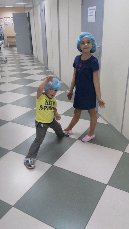 возле дверей реанимации, только в таком виде разрешила зайти посмотреть собачку после операции.