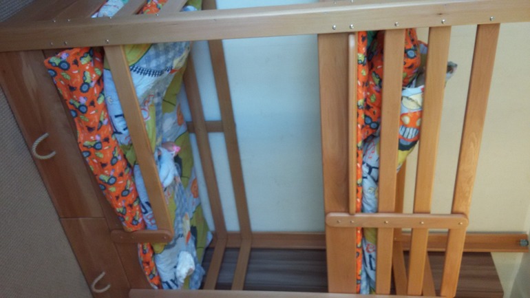 минусы: на верхнем ярусе сменить/застелить постель очень неудобно, хотя у меня роста 178 см