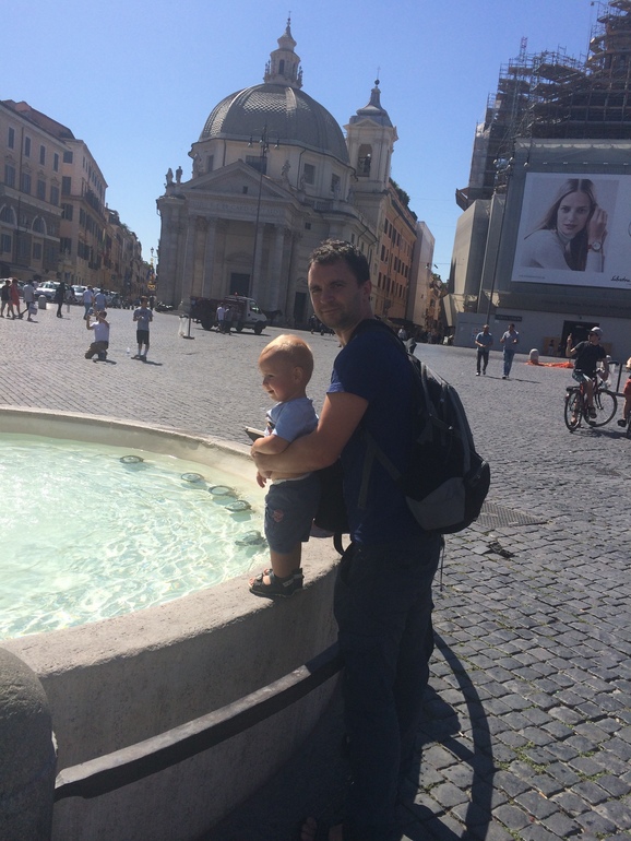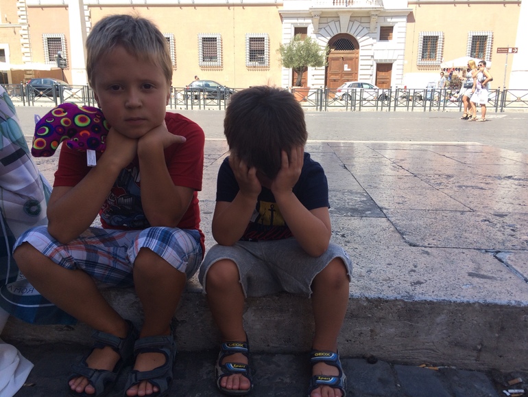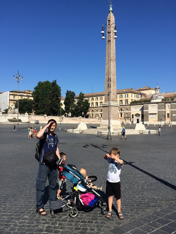 Несмотря на то, что пересадка была 7 часов, по факту на город было около трех. Мы доехали до Пьяцца-Дель-Пополо, побегали там в поисках обеда для детей, потом добежали до Вилла Боргезе, до испанской лестницы, которая оказалась закрыта на реконструкцию (хаха), галопом погнали, роняя на дорогу капли джеллато и снимая орущего Димку со всех фонтанов (которых в Риме слишком много для моих слабых нервов!!!), ко входу в парк, приземлились на скамеечку.... Фуууух....