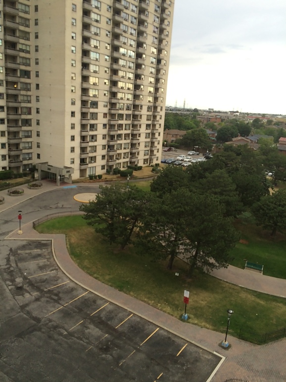 Пример про уровень жизни. Свекор мой живет в очень скромном кондо (ЖК). Купил там квартиру очень давно, и как-то прижился. По меркам Торонто это реально скромное жилье. У кондо закрытая территория под шлагбаумом, подземная отапливаемая парковка, одно место на котором бесплатно, второе за символические деньги, собственный бассейн, в доме, куда можно пройти не выходя на улицу. Скромно, чеужтам)) Двор: