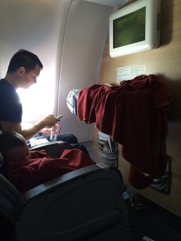 дальше нас ждал 8-часовой перелет до Торонто. Нам достался первый ряд с люлькой для инфанта. В связи с тем, что инфант уже не совсем инфант, а такой себе кабанчик, люлька была ему катастрофически мала, но тем не менее она сильно нас выручила. Димка в ней немножко спал, немножко сидел и немножко прыгал с нее на мои колени. Старшие дети не напрягали смотрели мультики, рисовали, читали и спали.