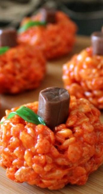 Маршмелоу разогреть со сливочным маслом в микроволновке при средней мощности до увеличения объема. Добавить хлопья, красители. Перемешать, сформировать "тыковки". Сверху украсить ириской и "листиком" из зеленого мармелада.