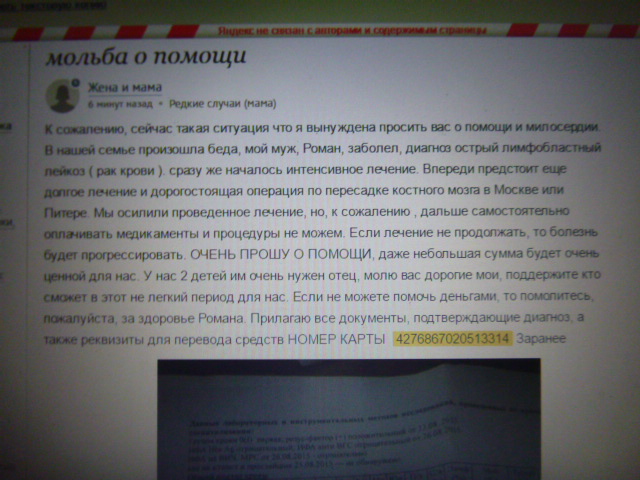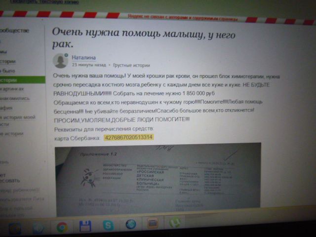 Детки многодетных семейДевочки, будьте внимательны! Женщина просящая помощи с номерами сбербанка 8276867020513314 и 4276832014899418 мошенница!!!! Вчера собирала деньги на умершего мальчика!
