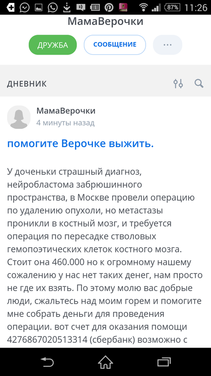 Вчера в ленте новостей постоянно мелькала некая Наталья. Собирала деньги для мальчика Захара. Я погуглила,у мальчик совсем другая мама и номер счёта. А вот счёт 9418 мне и запомнился. Кстати,если его задать в поиск выдаёт в результатах не только Захара,но и Веронику. Все сообщения и пользователи уже удалены. Одна и та же это дама сказать не могу