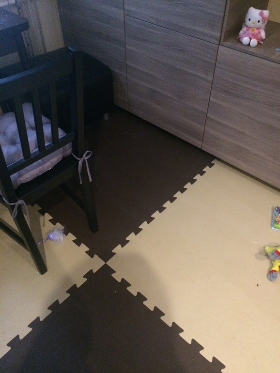 Я купила на кухню ( т к там Плитка ) покрытие для фитнесс центров ( большие квадраты ) . Мягко , моется , цветам разные есть .