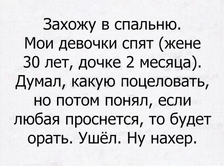 Вот интересно, от многих слышу, что если меня разбудят (без причины), я буду орать. А вот мне пофиг, проснусь посмотрю , что не время еще просыпаться, т.е не утро и дальше спать. А если еще муж разбудет для того , чтобы поцеловать, так вообще прекрасно, еще и с хорошим настроением, дальше спать.