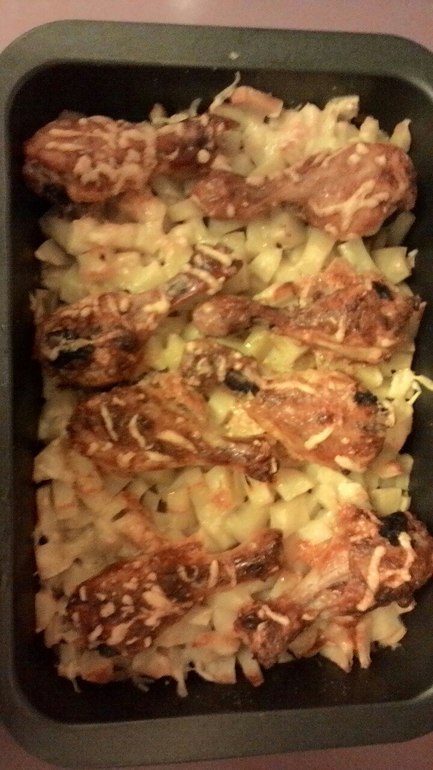 Меню большой семьиПриехала с работы и у меня было всего минут 20 до того ,как Катя должна была проснуться .Если интересно как готовить ,ныряйте в пост . Картошку почистить и нарезать кубиками , выложить на смазанный растительным маслом противень ,посолить и перемешать . Далее выкладываем сверху голени куриные .Они так и продаются уже в маринаде ,муж покупал в " Мяснов ".Ну и сверху я натёрла сыр . Духовка прогревалась пока я нарезала картошку .Ставим на час 200 градусов и ещё 20 минут на конвекцию ,ну или у кого нет конвекции ,тогда на 1ч 20 минут .