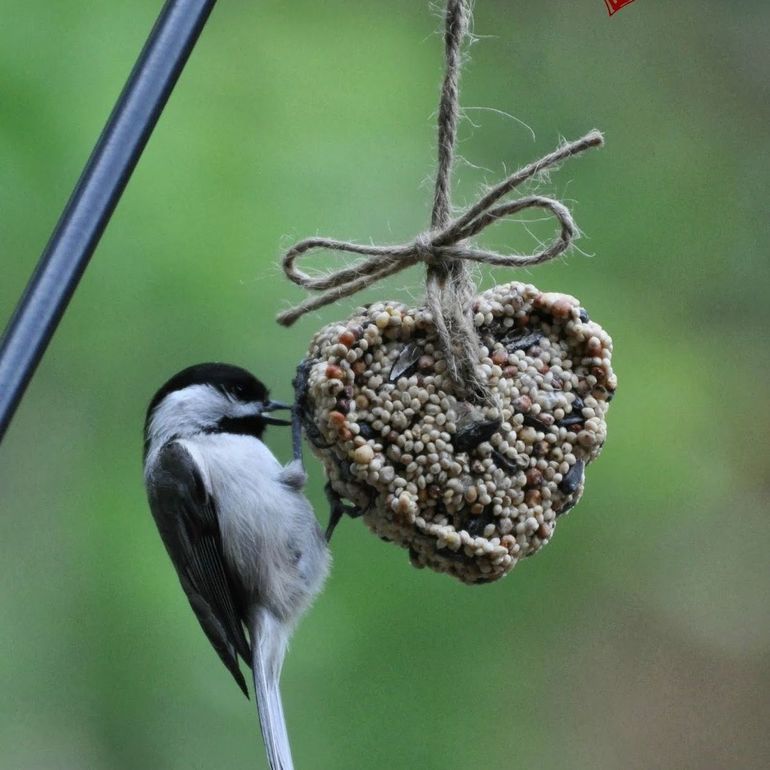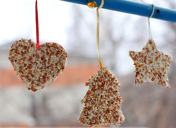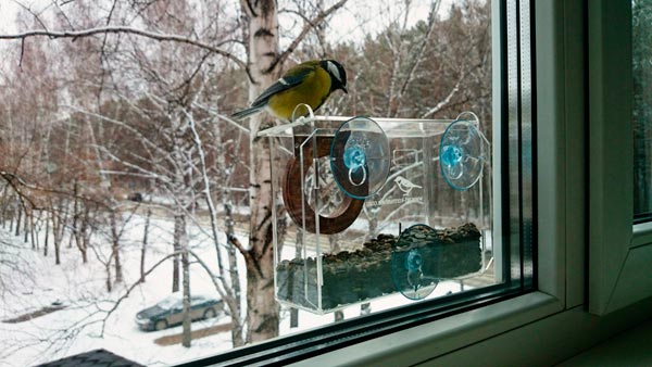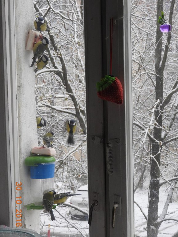 Мне нравится, когда кормушка за окном. У нас очень высокий этаж, тут птички не летают))) Вешаем на деревце в ближайшей аллее.